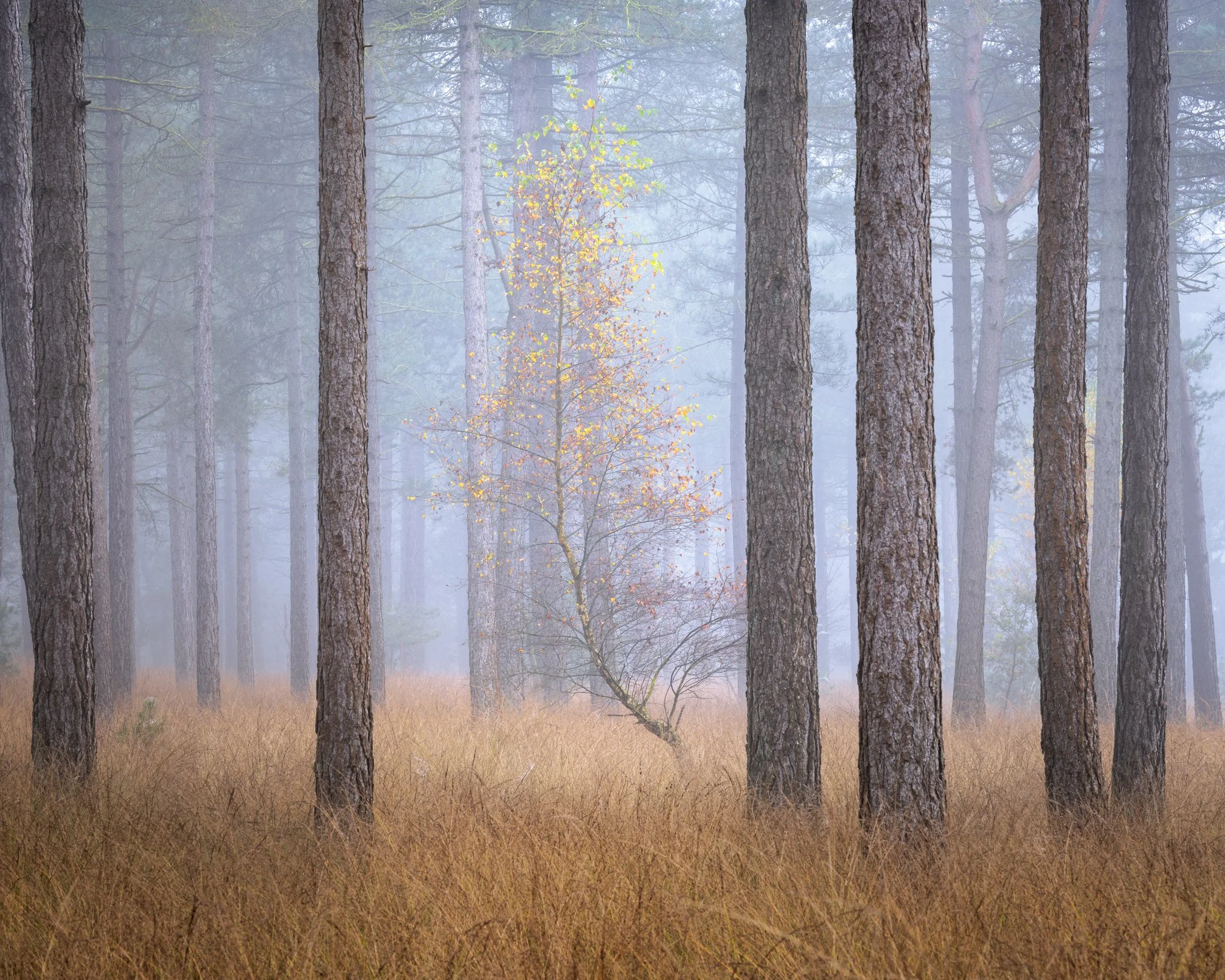 De herfst van 2024 was ongekend mooi. Fantastische mistige condities en mij heerlijk laten verrassen door gewoon rond te fietsen op de Veluwezoom. Mij laten leiden door het licht en op die manier nieuwe composities vinden. Deze locatie had ik tijdens een middag met mooi licht gevonden en ik was met die foto al enorm blij. Maar dit moment van 2 weken later spreekt mij meer aan. De mist en gedempte kleurtones geven zoveel meer rust in de foto.